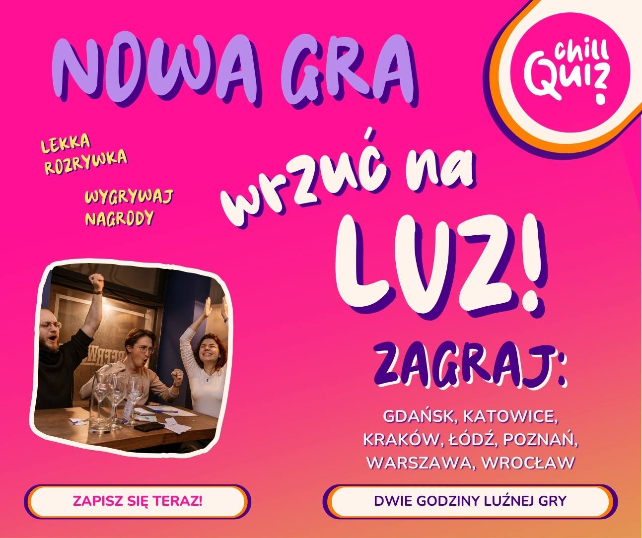ChillQuiz to gra z myślą o osobach, które szukają luźniejszej rozrywki. Pytania wcale nie są banalne, ale za to pełne szalonego vibe’u. Zapisz daty i graj z nami!