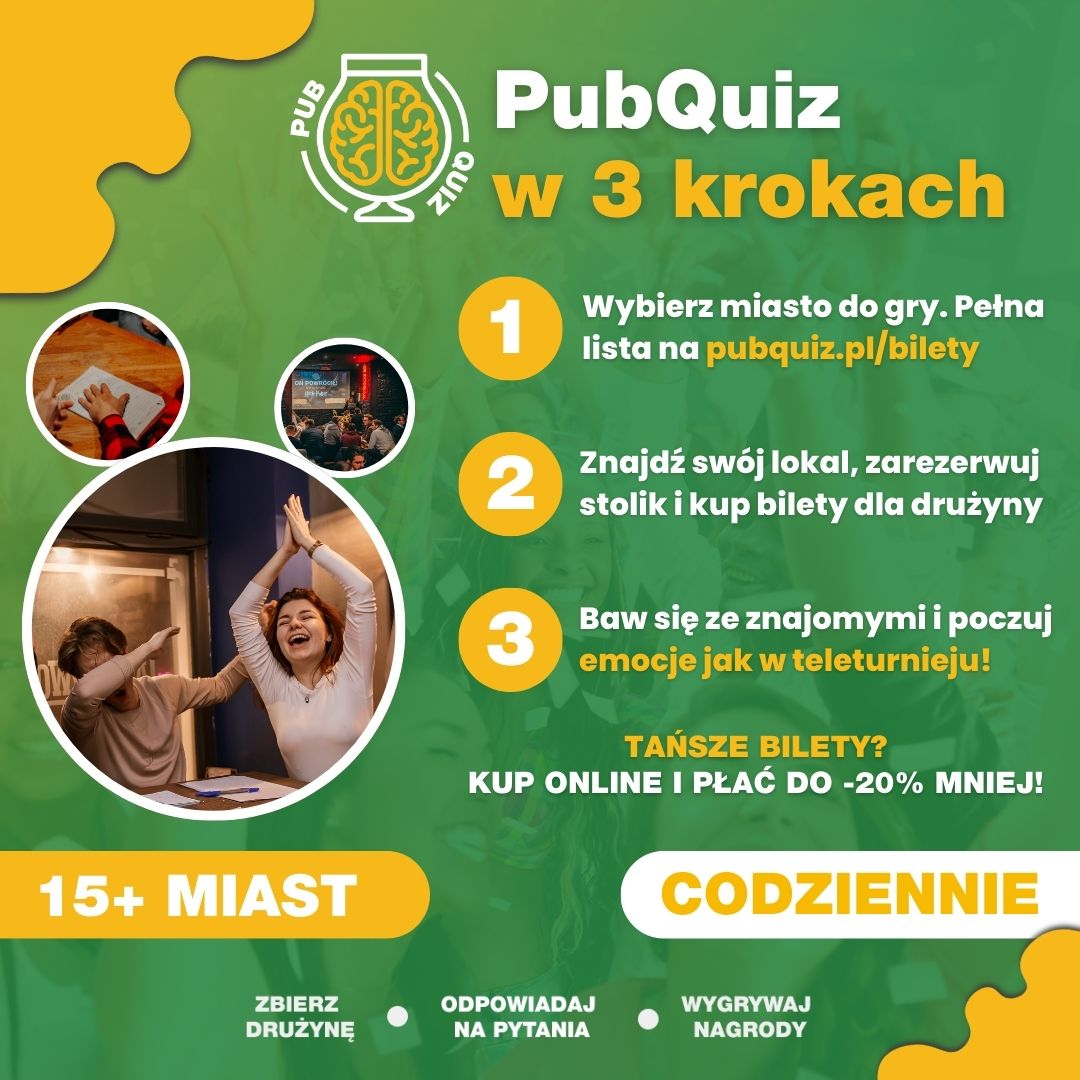 Wkręć się w społeczność PubQuizu: teraz z kodem TETRYCY -25% taniej (do 10.10.25, raz na użytkownika). Dołącz do gry w jednym z kilkunastu miast i baw się z nami podczas quizu na żywo z nagrodami!